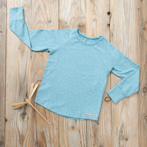 Dieses süße Langarm-Shirt in türkis mit glitzer Punkten, ist aus einem Bio-Baumwolle Jersey genäht. Der Schnitt ist ein Raglanärmel- Schnitt. Dieser passt immer sehr gut.