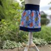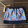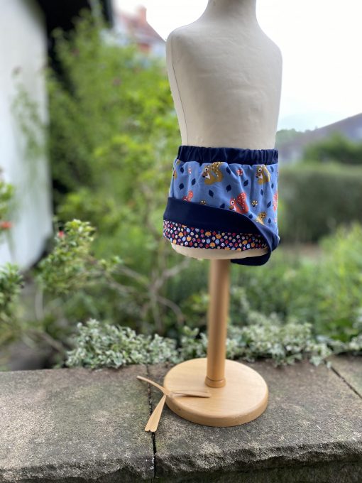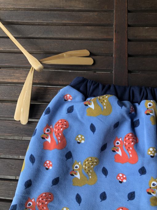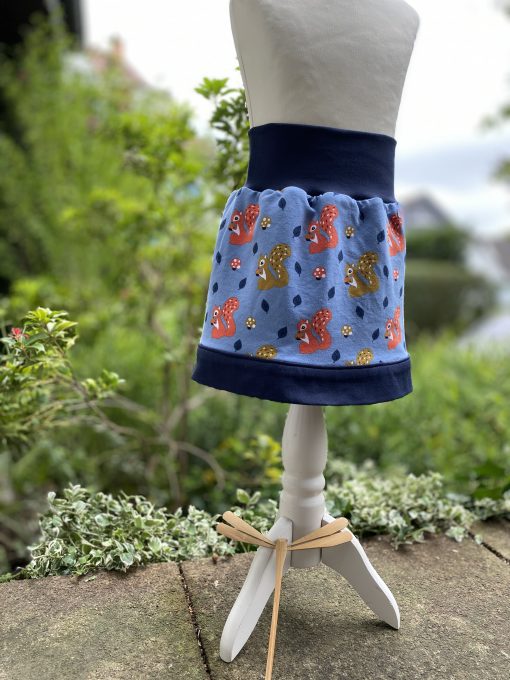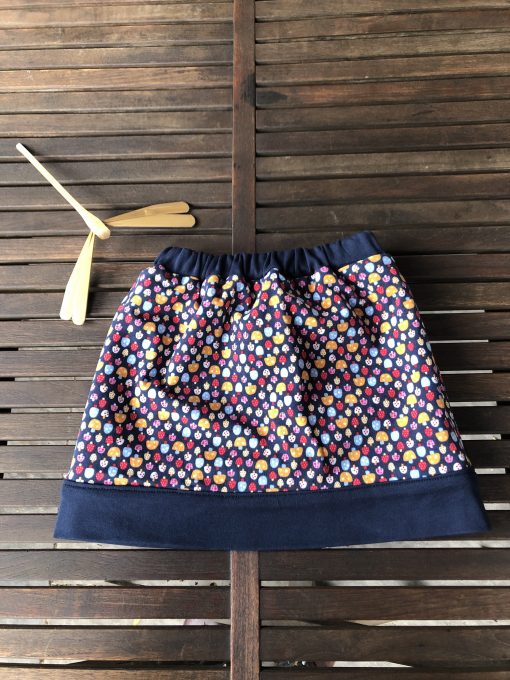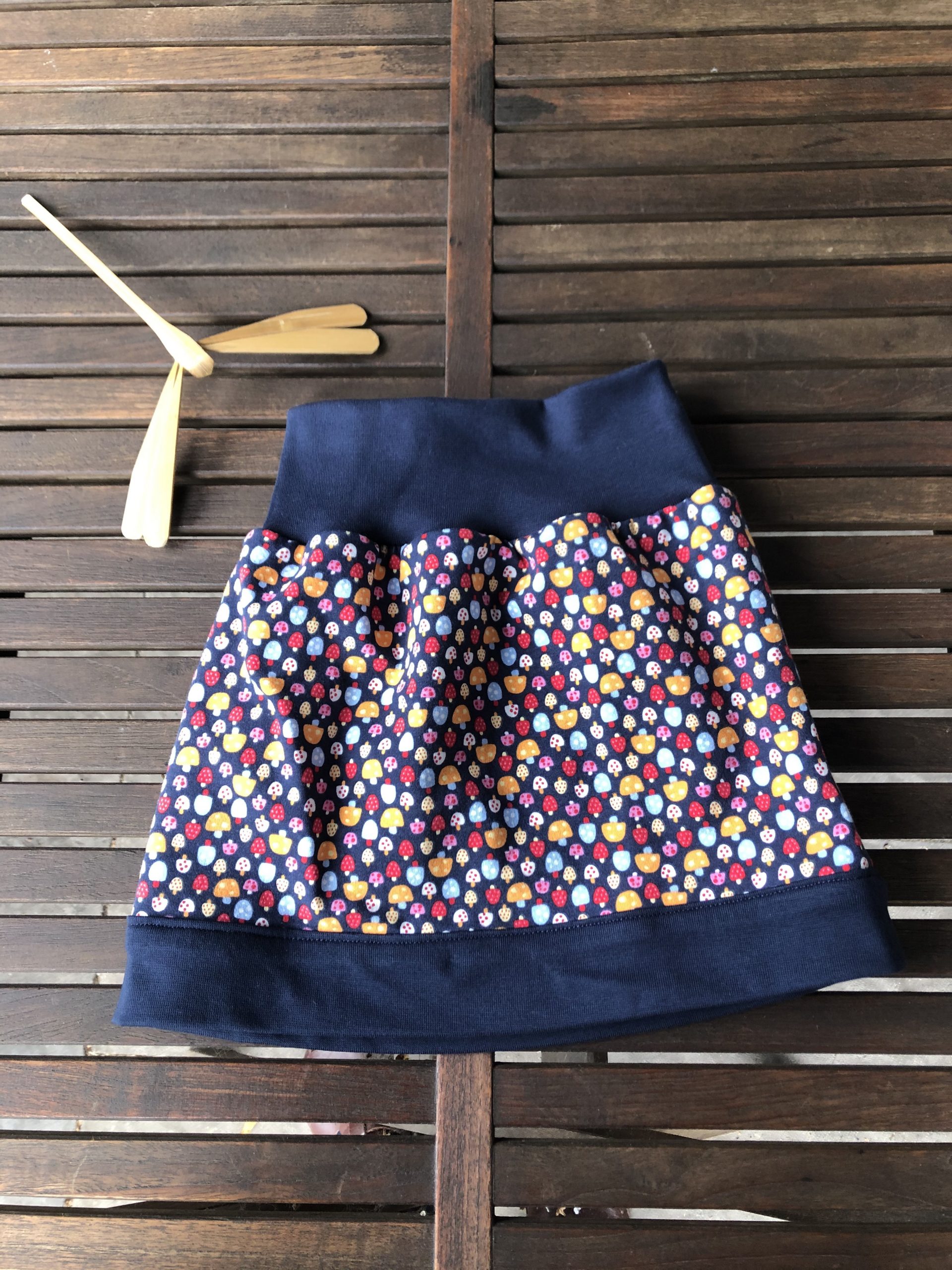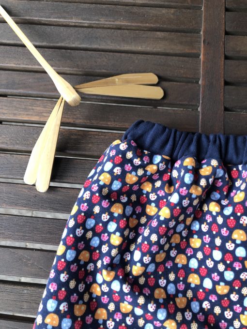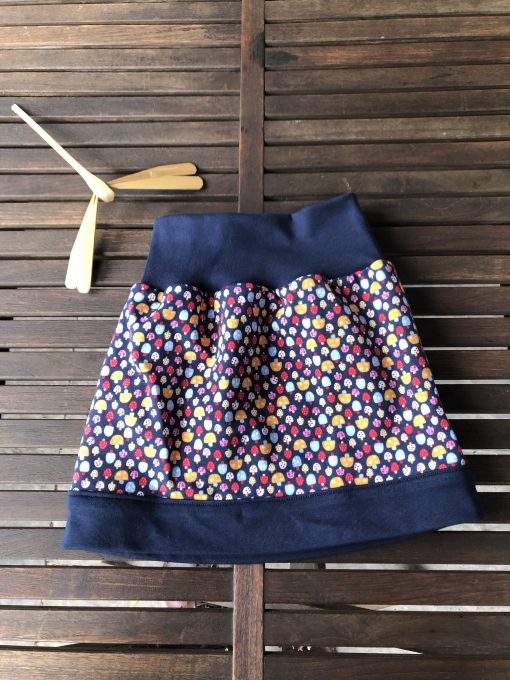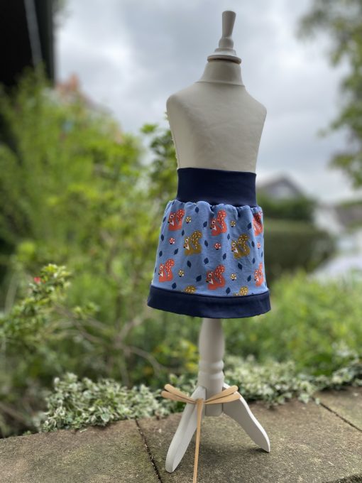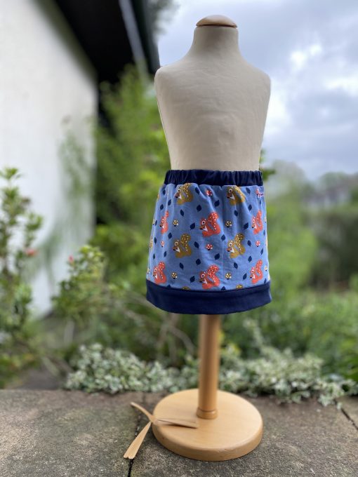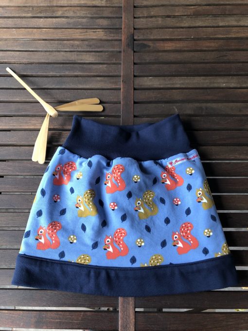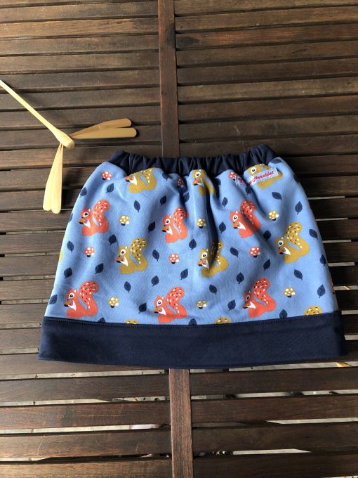 Hier habe ich einen Wenderock aus dem schönen Eichhörnchen Sommersweat und einem Jersey mit Pilzen genäht. Abgesetzt mit einem dunkelblauen Bio-Jersey. Sie haben somit zwei Röcke in einem. Super praktisch und super bequem.